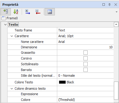 Proprietà specifiche Frame: categoria Testo Nella categoria Testo è possibile definire il titolo della frame. Testo frame Specifica il titolo del riquadro, visualizzato in altro a sinistra.