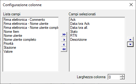 Per aggiungere una colonna spostarla dalla Lista Campi alla lista Campi Selezionati mediante gli appositi pulsanti. Per modificare l’ordine di visualizzazione utilizzare i pulsanti di spostamento verticale presenti a destra della lista Campi Selezionati.