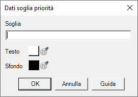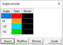 Apre la finestra di configurazione delle soglie per l’associazione dei colori agli intervalli di priorità. Per dettagli sulla configurazione delle soglie vedere la voce “Soglie Priorità” più avanti in questo paragrafo. |