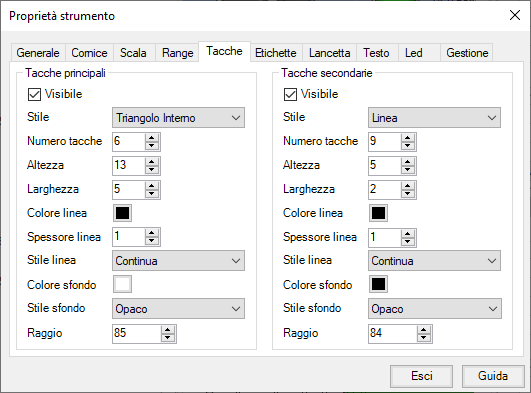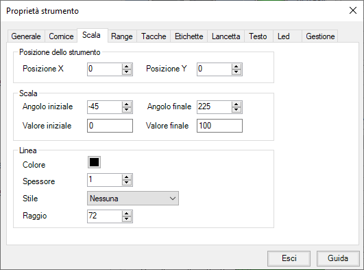 Le proprietà della categoria Scala consentono di definire l’aspetto del quadrante dello strumento.