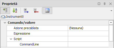 Proprietà specifiche Strumento: categoria Comando/Valore Nella categoria Comando/Valore è possibile specificare l’espressione collegata allo strumento. Espressione Specifica l’espressione collegata allo strumento, il cui valore determina la posizione della lancetta.