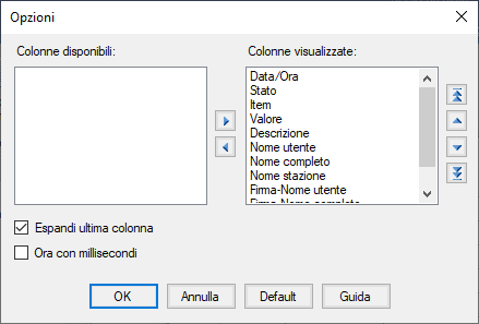L’ordine in cui le colonne appaiono nella lista Colonne Visualizzate rispecchia l’ordine di visualizzazione. È possibile modificare l’ordine di visualizzazione agendo sui pulsanti di spostamento verticale.