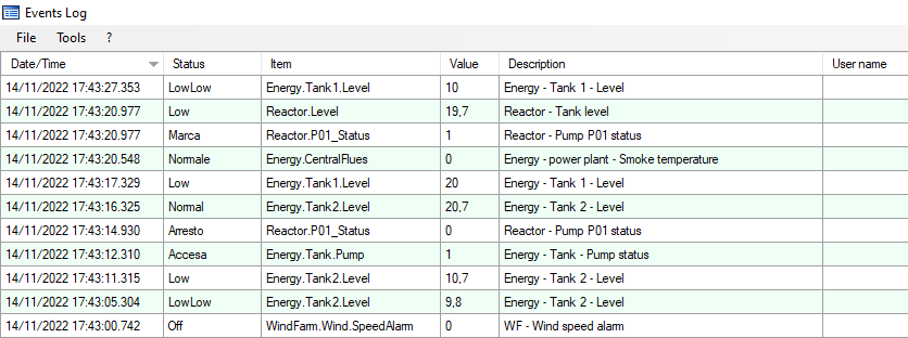 Il modulo mostra la lista scorribile degli allarmi/eventi registrati nei file di log correnti, a partire dal meno recente: