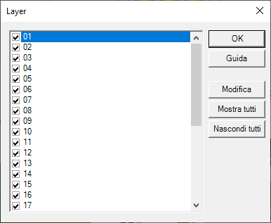 consentono di visualizzare o occultare rapidamente i primi otto layer disponibili, generalmente sufficienti nella maggior parte delle applicazioni. Una gestione più completa è consentita dalla finestra Gestione Layer, che consente inoltre di associare una descrizione a ciascun layer: